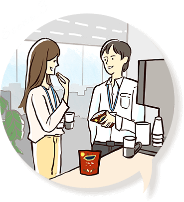 • オフィスで同僚と休憩時間に