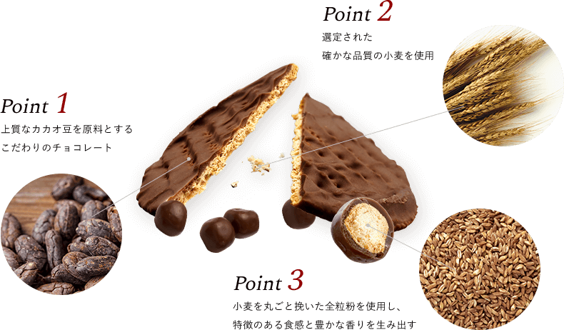 1892年当時の開発担当者が⼩⻨の表⽪・⻨芽をまるごと挽いた全粒粉でビスケットを製造。